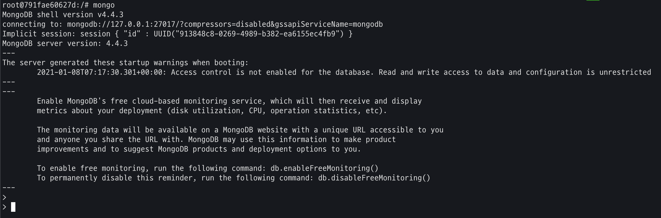 성공적으로 mongodb container에 접속했다면, 이제 mongo shell을 사용하여 mongoDB에 접속! mongodb conatiner는 이미 mongoDB가 설치되어 있기 때문에, 간단하게 mongo 커맨드만 치면 mongo shell에 접속할 수 있다.