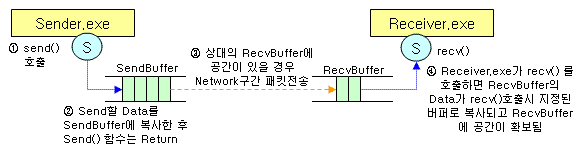 - send()함수는 인자로 주어진 Buf의 데이터를 해당 Socket에 할당된 출력스트림(버퍼)로 복사하고 Return한다.