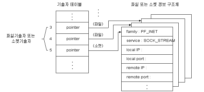 fd와 sd는 중복되지 않으며, 위 그림은 응용프로그램에서 2개의 파일과, 1개의 소켓을 생성했을 때, 기술자 테이블의 상태를 나타낸다.
